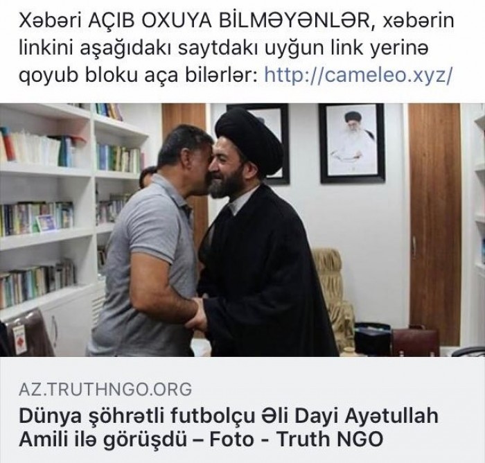 Tarix : 07 İyul 2018, 22:32 Azərbaycandakı olaylar kiçik araşdırma aparmağa əsas verdi. Bir səhifənin izinə düşərək böyük bir şəbəkəyə çıxış yarandı. Azərbaycanda yasaqlanan az.truthngo.org saytında gedən yazılar belə başlıqlarla verilib: "Azərbaycanın ATV kanalı İran mədəniyyətinə qarşı”. "Dünya şöhrətli futbolçu Ayətullah Amili ilə görüşüb”.