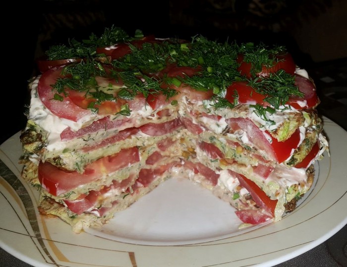 Əvvəlcə kabakları sürtgəcdən keçirib suyunu buraxması üçün 1 - 2 çay qaşığı duz əlavə edirik və gözləyirik ki, suyunu buraxsın. Suyunu buraxdıqdan sonra kabakların suyunu yaxşıca sıxırıq. Sonra üzərinə yumurta, un, doğranmış şüyüd əlavə edib qarışdırırıq. Sonra tavaya duru yağ tokub qızdırırıq. Hazırladığımız qarışıqdan qaşıqla tavaya töküb kreplər bişiririk. Kreplərin hər iki üzünü qızardırıq. Kreplər soyuduqdan sonŕa düz boşqaba 1 qat krep qoyub üzərinə mayonez çəkirik, onun da üzərinə halqa şəklində doğranmış pomidor düzürük və prosesi təkrar edirik. Sonda üzərini zövqə görə şüyüdlə bəzəyirik.