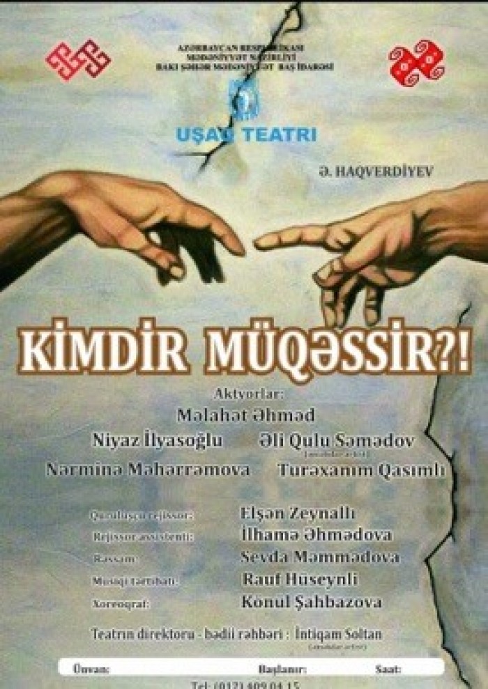 - Premyera iyunun 12-də saat 18:00 - da Gənc Tamaşaçılar Teatrında olacaq. Ə. Haqverdiyevin “Kimdir müqəssir” pyesi əsasında hazırladığım tamaşadı. Kiçik bir ailənin timsalında böyük bəşəri problemlər, insanın təkamül yolu, qadın-kişi münasibətlərindəki anlaşılmazlıqların doğurduğu faciələr əks olunur. Rolları Niyaz İlyasoğlu, Məlahət Əhməd, Əliqulu Səmədov və başqa istedadlı aktyorlarımız ifa edirlər.