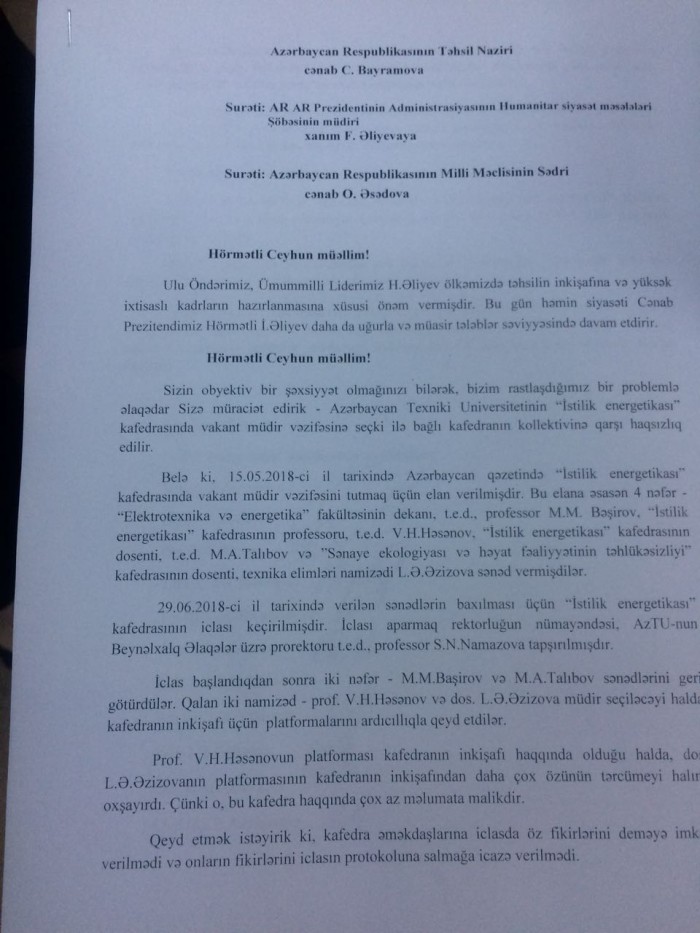 Sizin obyektiv bir şəxsiyyət olmağınızı bilərək, bizim rastlaşdığımız bir problemlə əlaqədar Sizə müraciət edirik - Azərbaycan Texniki Universitetinin "İstilik energetikası” kafedrasında vakant müdir vəzifəsinə seçki ilə bağlı kafedranın kollektivinə qarşı haqsızlıq edilir.