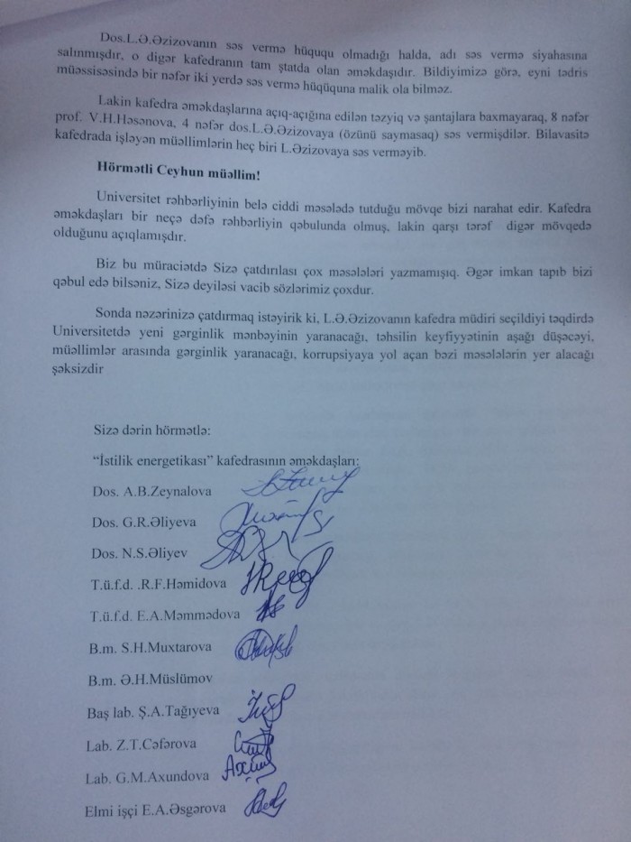 Sonda nəzərinizə çatdırmaq istəyirik ki, L.Ə.Əzizovanın kafedra müdiri seçildiyi təqdirdə Universitetdə yeni gərginlik mənbəyinin yaranacağı, təhsilin keyfiyyətinin aşağı düşəcəyi, müəllimlər arasında gərginlik yaranacağı, korrupsiyaya yol açan bəzi məsələlərin yer alacağı şəksizdir